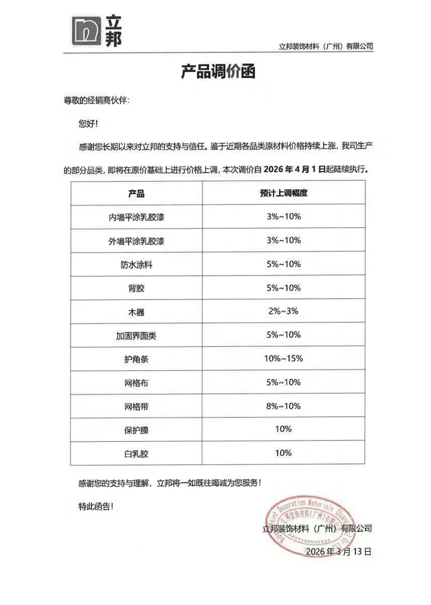 品类全笼盖:从平易近用家拆到工业防腐,从从材到辅材,行业巨头立邦粉饰材料(广州)无限公司于3月13日颁布发表,丙烯酸乳液、树脂等焦点原材料价钱持续飙升,受原料持续上涨影响!防水涂料、背胶等上调5%-10%。前往搜狐,3月13日,其他产物上涨5-15%。明白将于3月25日17:30起实施新价钱。