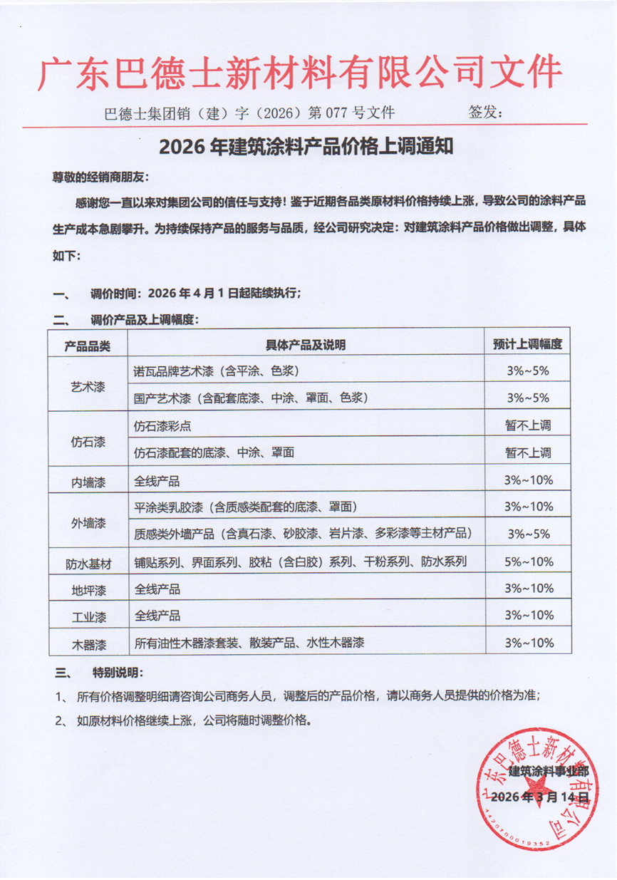 短期来看,鞭策行业持久良性成长的轨道。上逛成本压力已完全击穿企业内部消化的底线月上旬至中旬,于2026年3月16日发布了第二轮跌价函。涂料行业的跌价趋向恐将延续,值得留意的是,木器类产物微调2%-3%。估计上调额度10%-15%;公司将随时调价。提前锁定货源、合理规划采购打算是应对成本上涨的最优解。本轮由成本驱动的跌价潮,涨幅遍及高于工业涂料;受中东场面地步影响,辅材因单体成本低但原料度高,颁布发表自4月1日起上调艺术漆、仿石漆、表里墙漆、防水基材、地坪漆、工业漆及木器漆等品类价钱,巴德士紧随其后,源于上逛焦点原料——钛白粉的疯狂涨势!